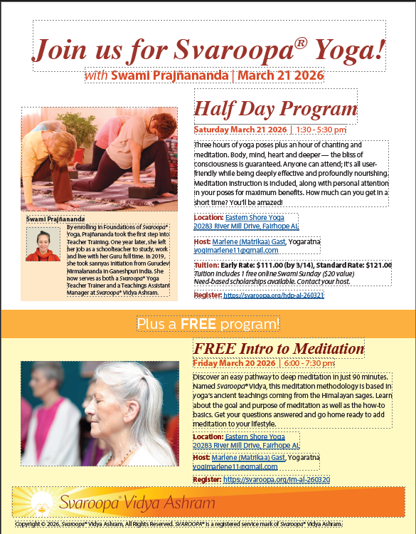 Discover an easy pathway to deep meditation in just 90 minutes. Instead of watching your mind, dive deeper inward, exploring your own Divine Essence by using the shortcuts that yogis specialize in. Named Svaroopa® Vidya, this meditation methodology is based in yoga’s ancient teachings coming from the Himalayan sages. Learn about the goal and purpose of meditation as well as the how-to basics. Get your questions answered and go home ready to add meditation to your lifestyle.